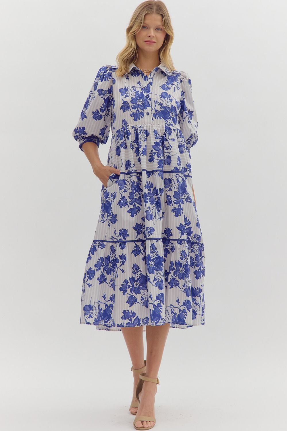 Floral print cuff band ¾ puff sleeve tiered mini dress featuring contrast binding detail. Collar button front closure. Pockets at sides. Lined. Woven. Non-sheer. Lightweight.