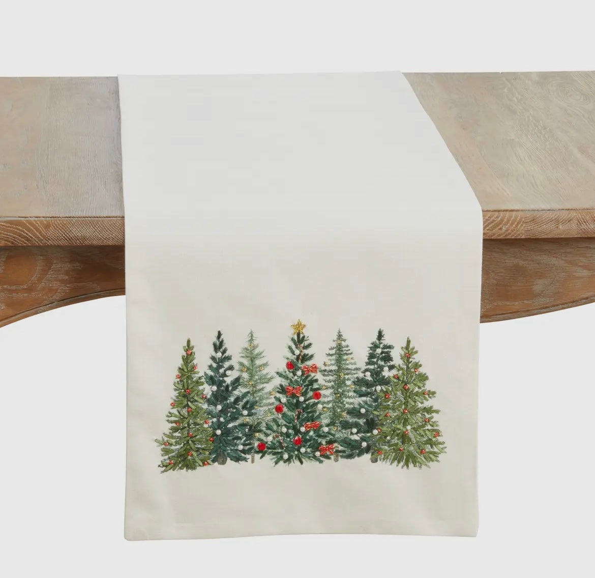 Enhance your holiday table with our beautiful Christmas Tree Table Runner. With delicate ribbon and pearl accents, this fully backed runner features a festive tree design in classic ivory. Measuring 16 inches wide and 72 inches long, it's the perfect addition to your tablescape. Gorgeous detail on both ends of runner.