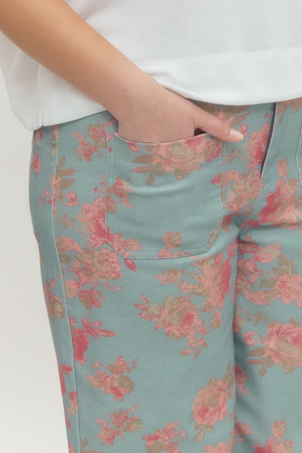 Floral pattern mid-rise ankle-length pants. Button zip-fly closure at front. Patch pockets at front and back. Unlined. Woven. Non-sheer.