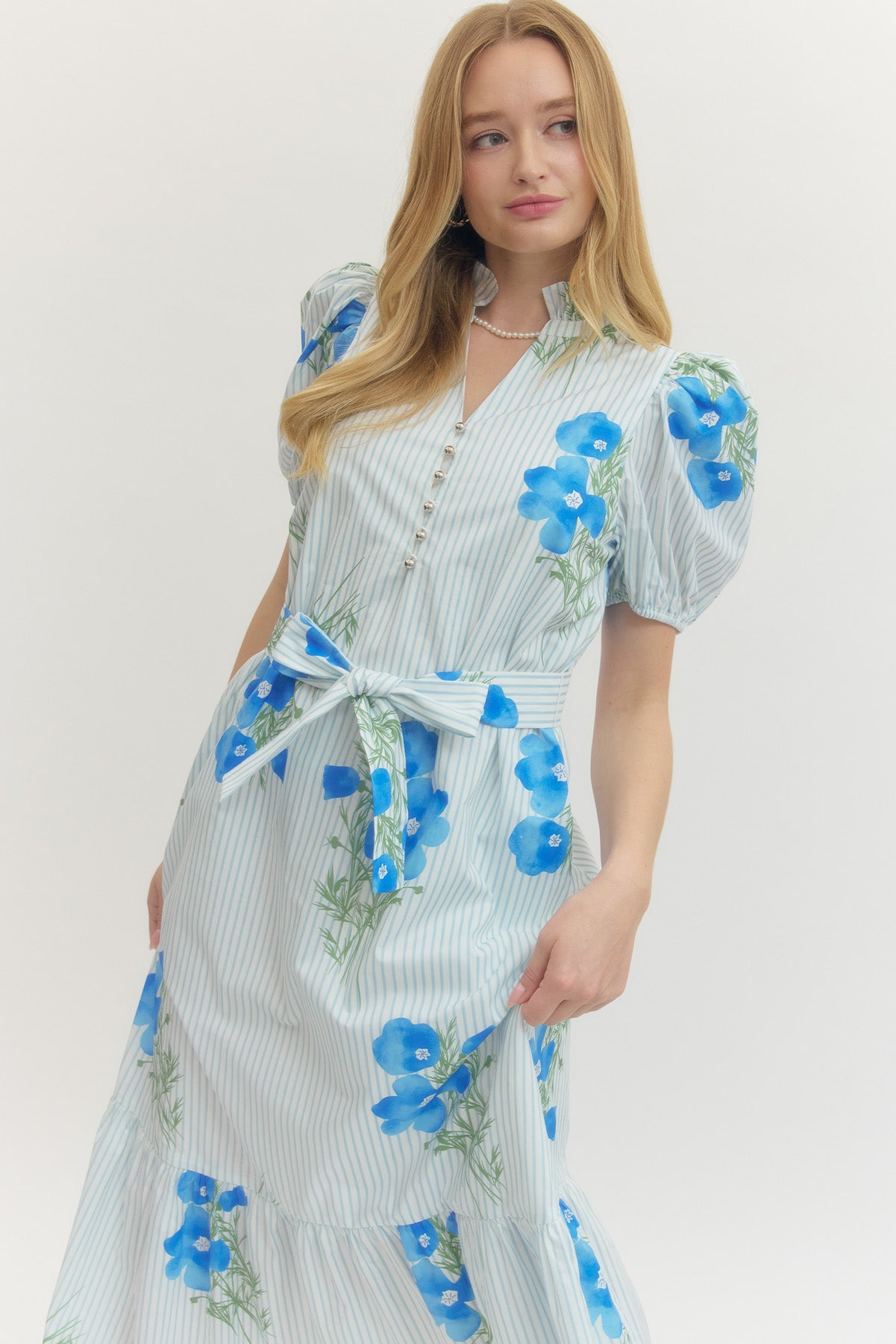 Floral stripe print short puff sleeve midi dress featuring ruffled stand collar and half button closure at front. Self-tie belt at waist. Side pockets. Ruffle hem. Lined. Woven. Non-sheer. Lightweight.