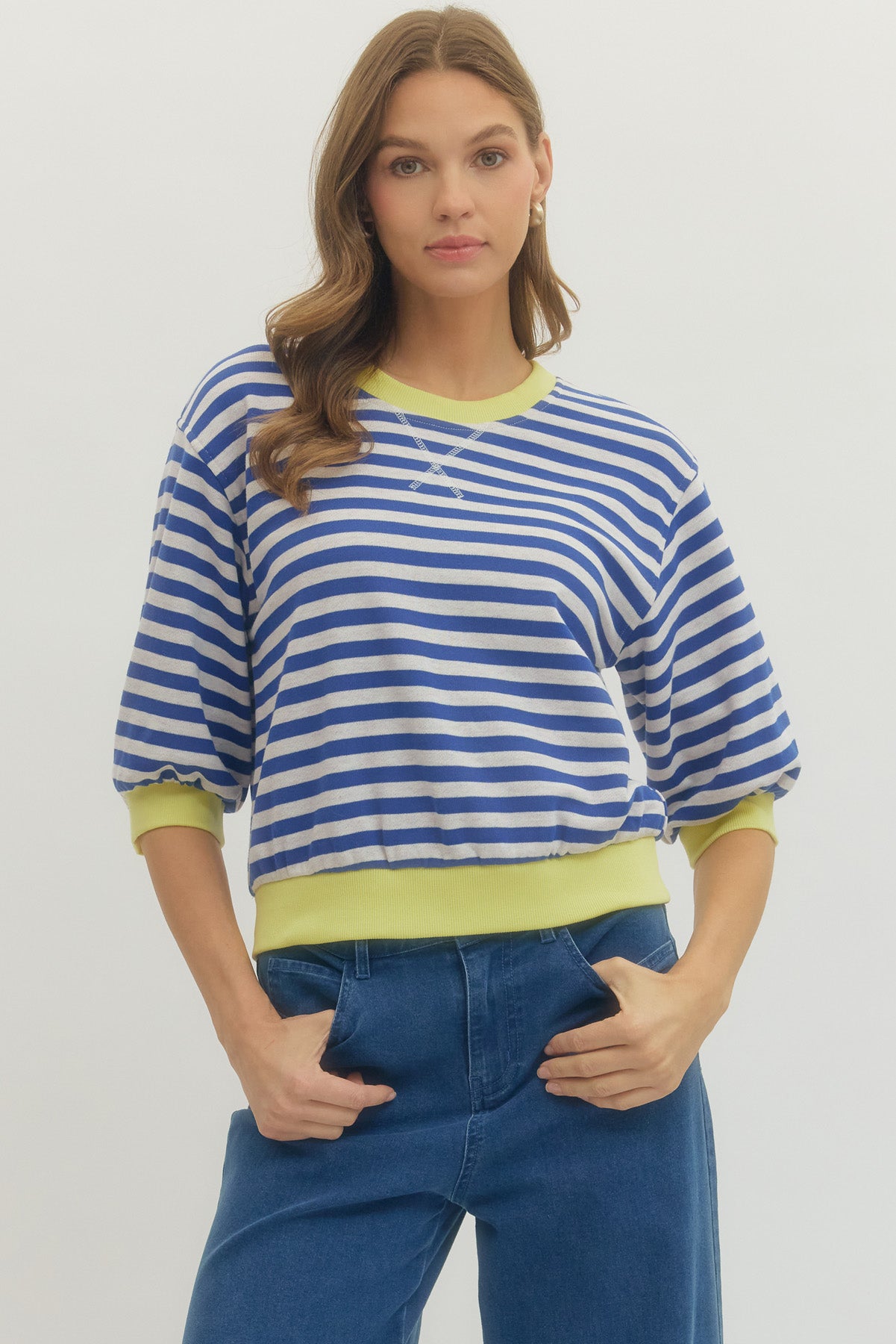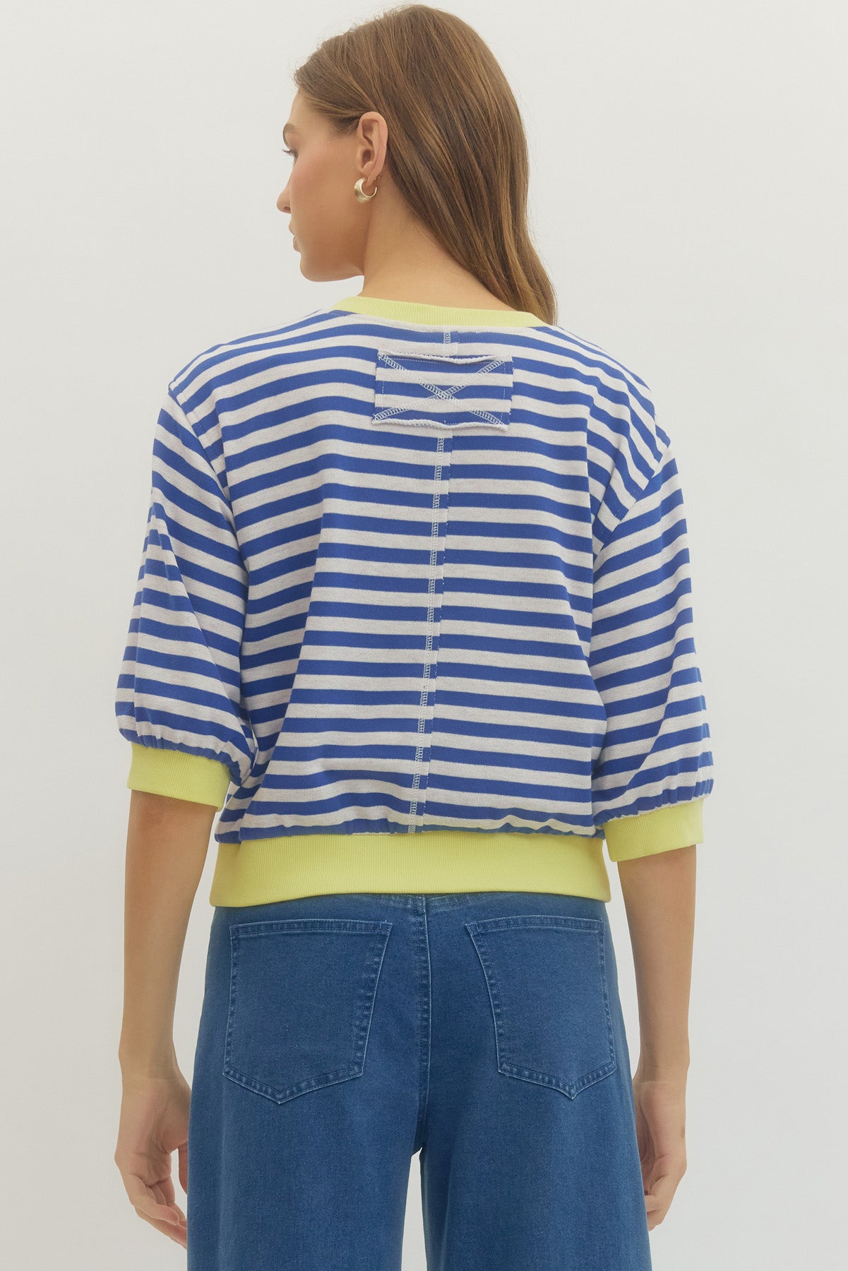 The Clifton Top is a lightweight, striped half-sleeve knit top, designed with a ribbed neckline, cuffs, and hem for added durability. Made from a 50/50 blend of polyester and cotton, it offers breathability and comfort while ensuring non-sheer coverage. Ideal for casual or semi-formal settings.