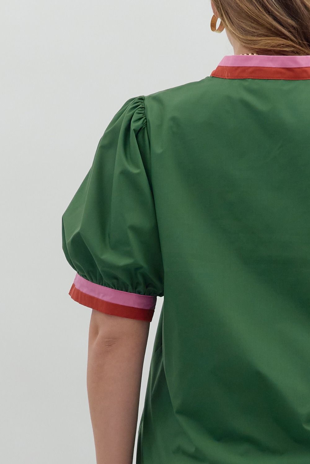 Solid short bubble sleeve featuring multicolor band finish. Unlined. Woven. Lightweight.