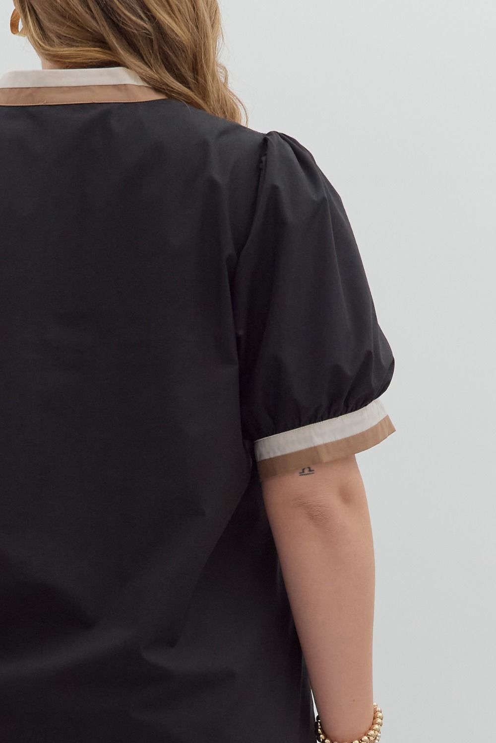 Solid short bubble sleeve black top featuring multicolor band finish. Unlined. Woven. Semi-sheer. Lightweight.