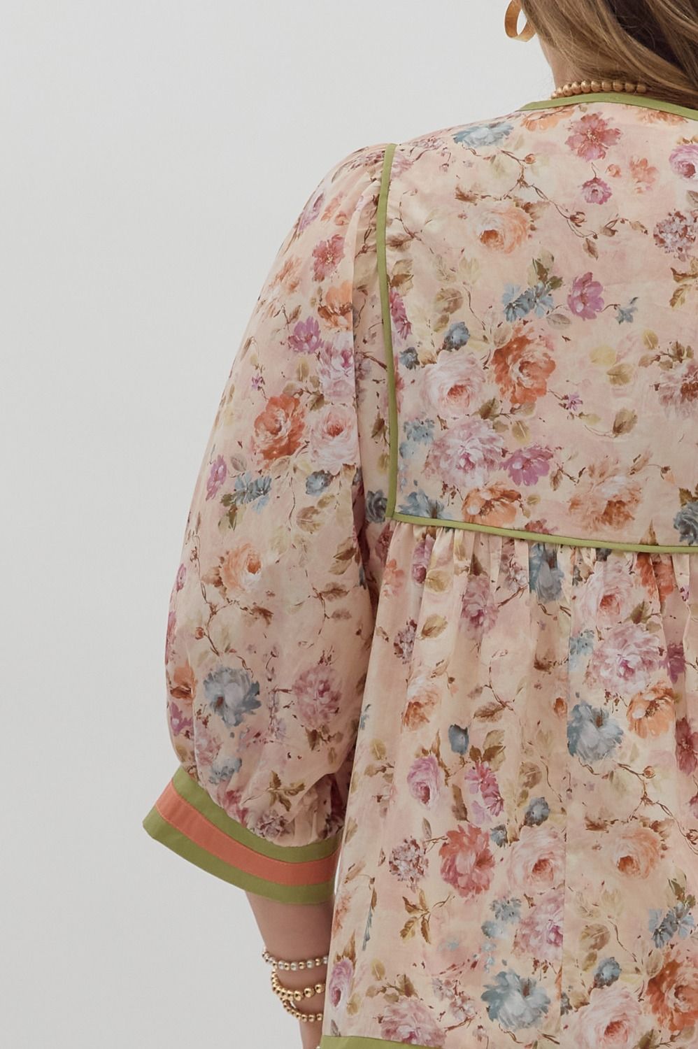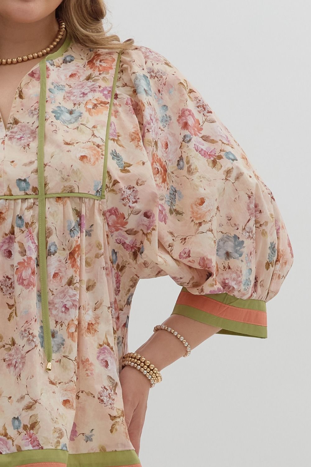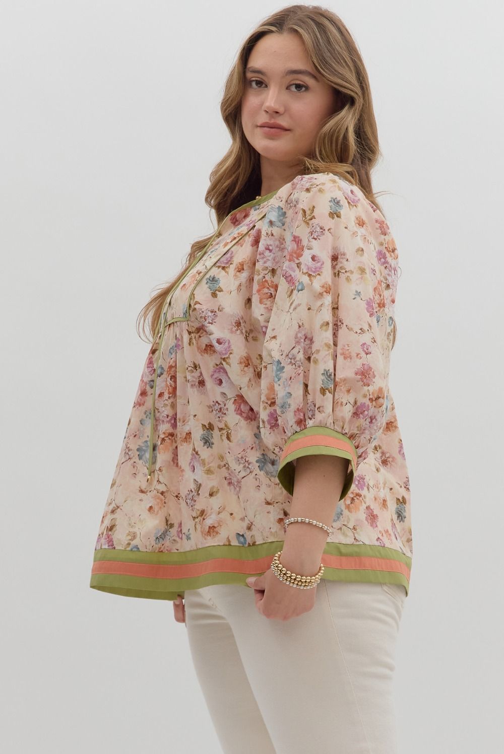 Vintage floral pattern ¾ sleeve empire waist loose top featuring multicolor accent band. Unlined. Woven. Non-sheer. Lightweight.