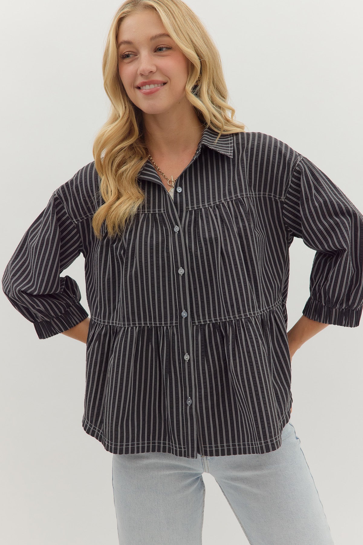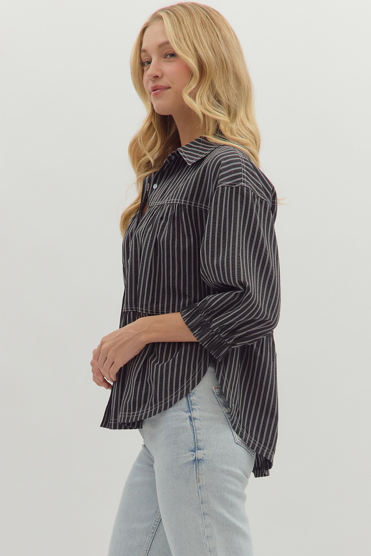 The Monique Top is a sophisticated and versatile addition to any wardrobe. This button down top features flattering pin stripes and small pleat details . Its 3/4 sleeves add a touch of sophistication to any outfit. Perfect for both casual and professional settings.