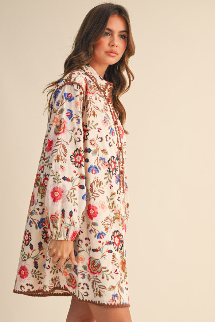 Stroll around looking casually cute in this floral print mini dress! This dress, in an exclusive floral print, forms a collared neckline with a half button down placket and long puff sleeves with elastic cuffs. Contrast color blanket triangle stitch accents the neckline, shoulders, button placket, and mini hem. Pair with sneakers or boots for a casual look that works for any day of the week!