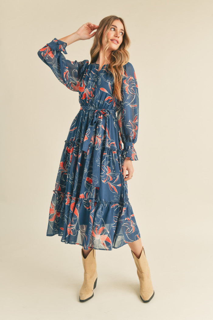 Be swept away by romance in this tiered button down midi dress! Woven, lightweight fabric, in an &merci exclusive floral print, shapes this dress that has long balloon sleeves, a notched V neckline, and button down front. An elastic waist with self tying sash tops a ruffle tiered midi skirt.