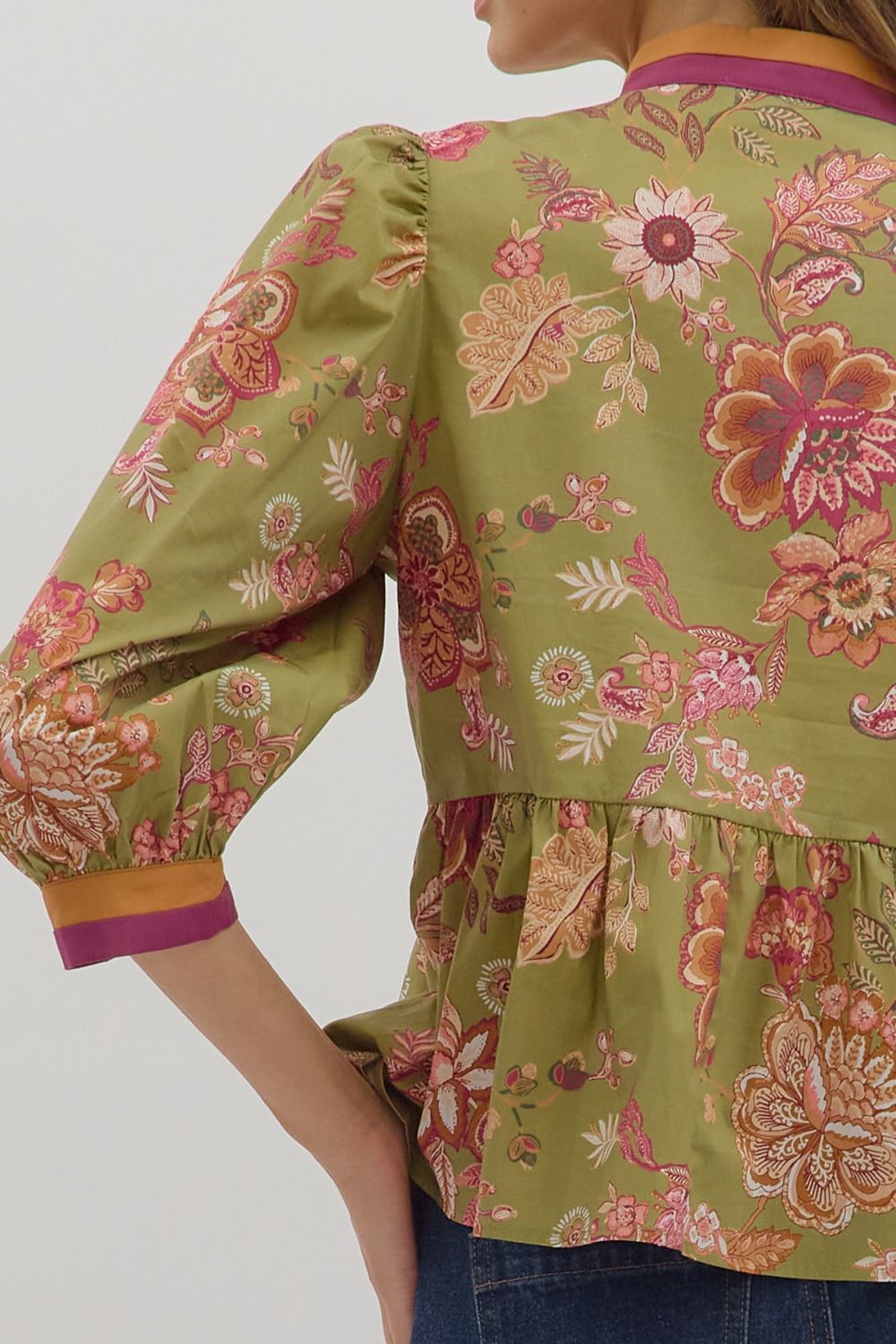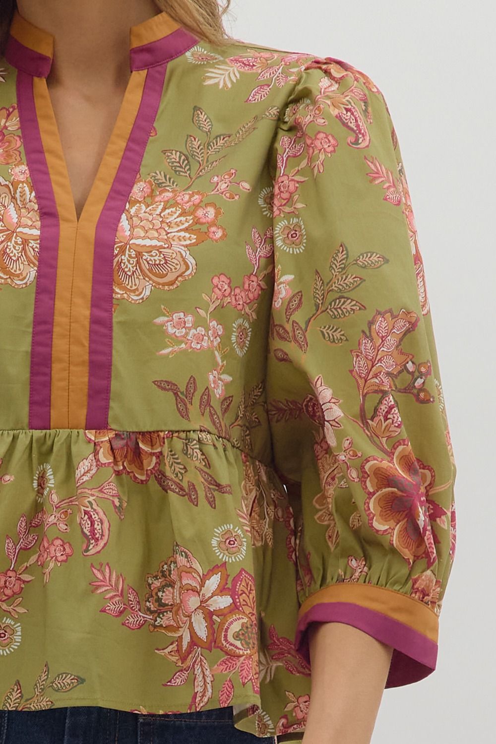 Botanical print ¾ sleeve top featuring contrast binding V-neck and peplum waist. Unlined. Woven. Non-sheer. Lightweight.