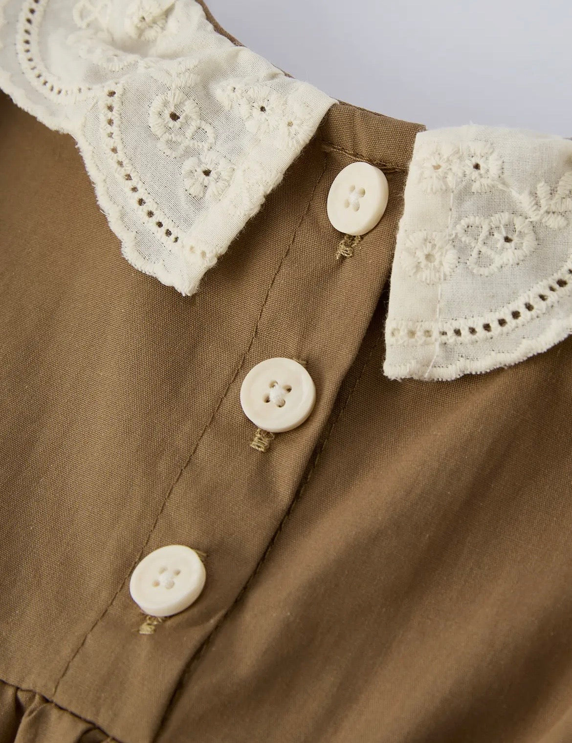 Delight your little one in this charming toddler girl's long sleeve dress, featuring delicate floral embroidery in soft white and khaki tones. Crafted for comfort and style, this dress offers breathable fabric and a gentle fit, perfect for everyday wear or special occasions. The timeless design brings a sweet, natural elegance to her wardrobe while allowing freedom of movement throughout her busy day.